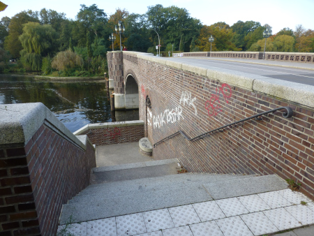 Vom Baudenkmal führt eine Aussentreppe zu 2 Fähranlegern (Krugkoppelbrücke Ost/West) für Alsterdampfer der Linie 52.