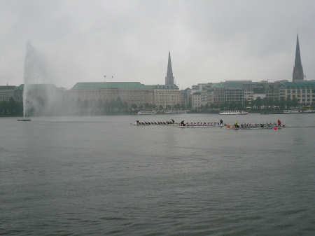 Das Drachenbootrennen Enter The Dragon 2011 in Hamburg vom Neuen Jungfernstieg aus gesehen. Im Hintergrund ist die Lombardsbrücke zu erkennen.